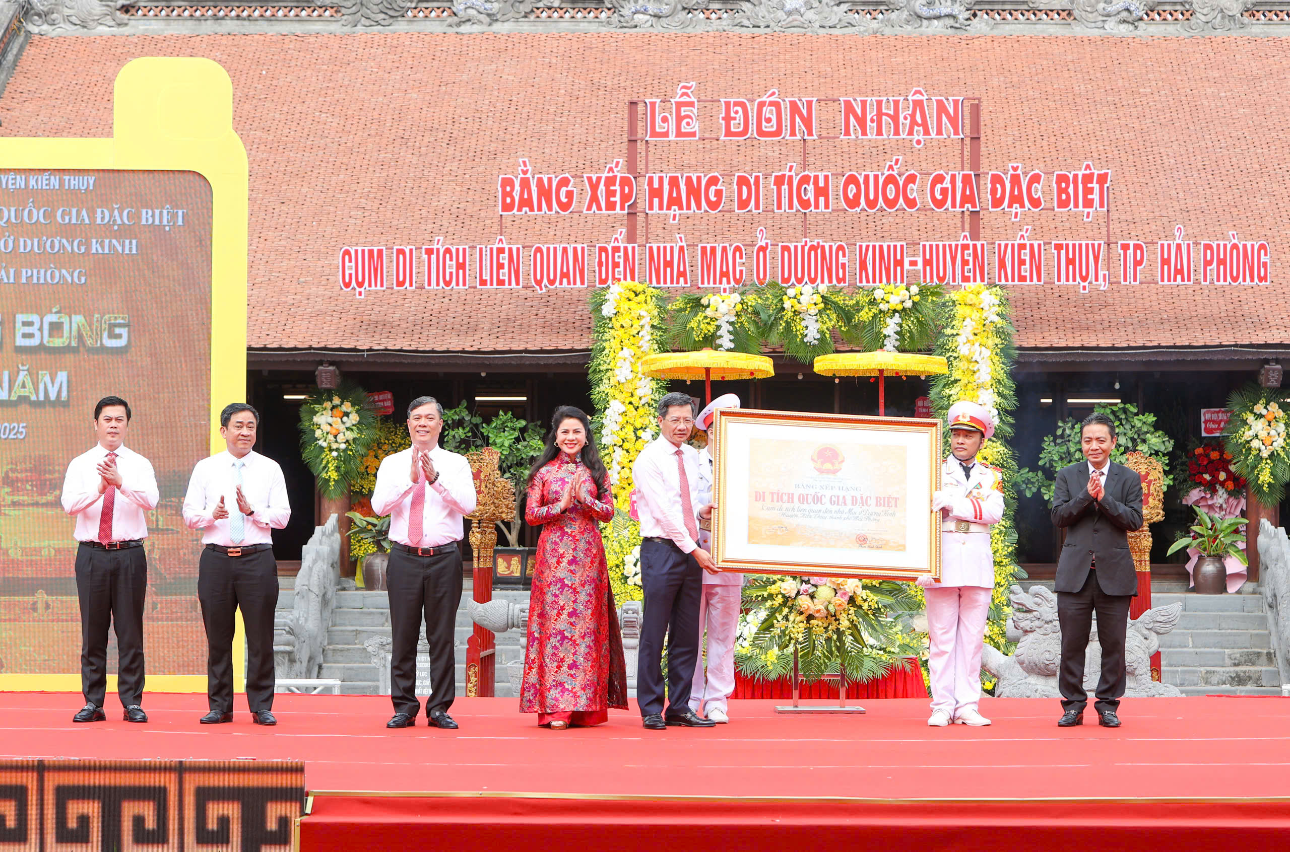 4月19日上午,建瑞县隆重举行了接受建瑞县阳京与莫氏相关的国家特别遗迹群排名证书的仪式。位于阳京,与莫氏相关的遗迹群包括五个突出文物,包括:莫朝国王纪念区、莫氏祠堂、和柳寺庙、茶芳寺和仁斋寺。这些文物不仅反映了莫氏王朝的繁荣时期,还融合了文化、历史、艺术价值以及独一无二的碑文。2025年1月17日,该遗迹群被正式列为国家特别遗迹。以“莫氏辉煌- 永存千年”为主题,建瑞县阳京与莫氏相关的国家特别遗迹群排名证书接受仪式不仅弘扬了历史价值,还肯定了港口城市在保护民族文化遗产方面的地位。同时,这也是建瑞县乃至海防市推动文化旅游宣传、促进经济社会发展与融入国际的契机。